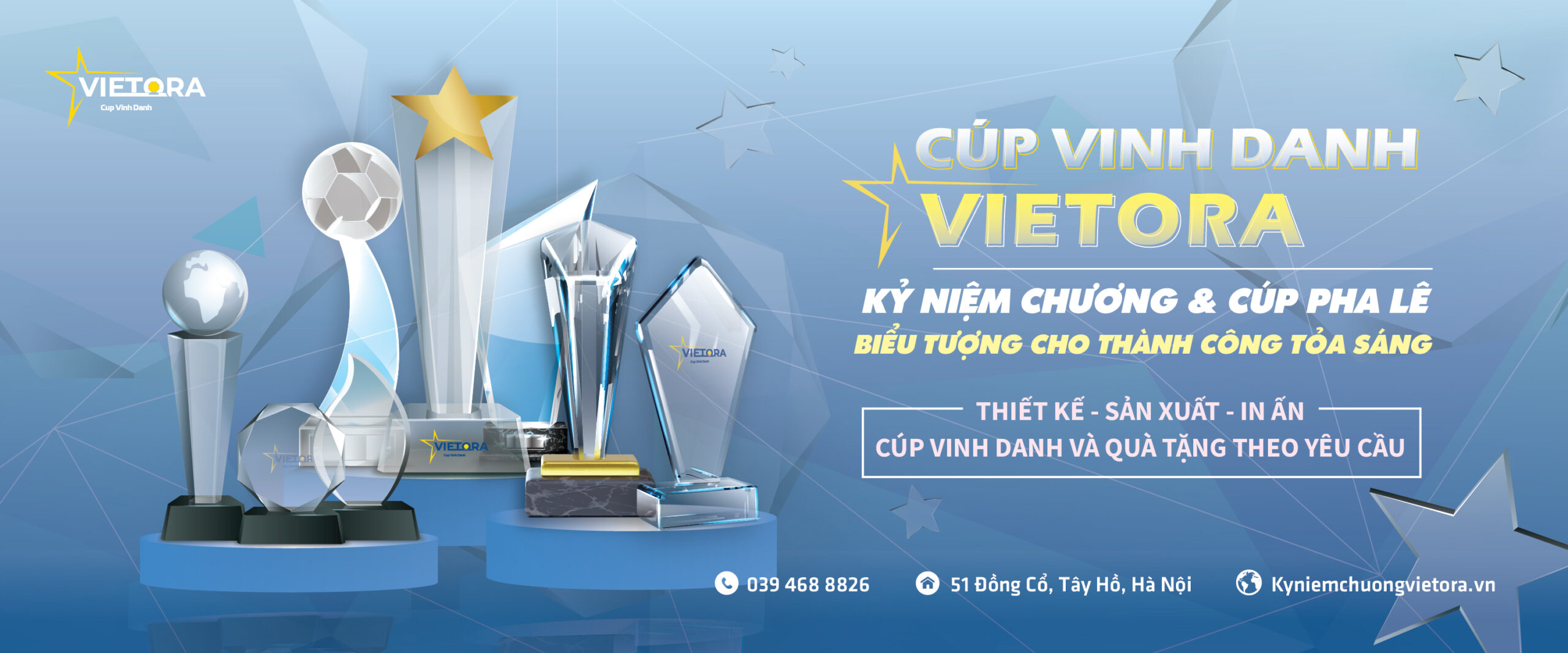 Kỷ niệm chương Vietora là đơn vị hàng đầu trong lĩnh vực sản xuất và cung cấp cúp pha lê vinh danh, quà tặng sự kiện và biểu trưng doanh nghiệp. Với hơn 10 năm kinh nghiệm, chúng tôi tự hào là đối tác tin cậy của hàng nghìn khách hàng trên toàn quốc.