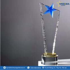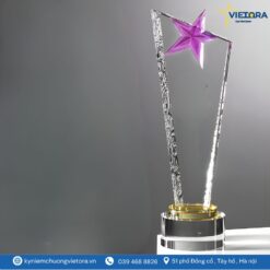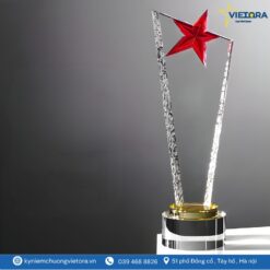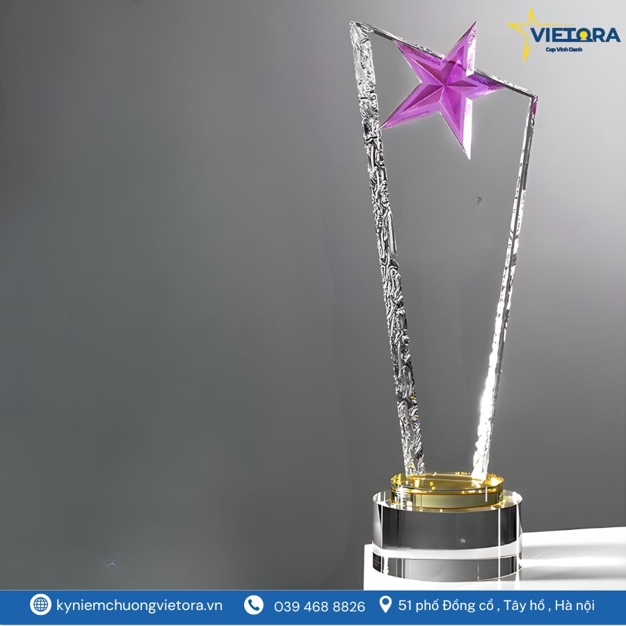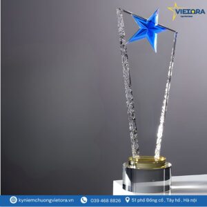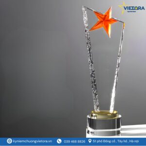 Mẫu kỷ niệm chương ngôi sao pha lê của Vietora được thiết kế với cảm hứng từ hình ảnh ngôi sao tỏa sáng – biểu tượng cho thành công, vinh quang và sự nỗ lực không ngừng. Phần thân cúp được chế tác từ pha lê cao cấp trong suốt, tạo hiệu ứng ánh sáng lung linh khi đặt dưới đèn, làm nổi bật vẻ đẹp tinh tế và hiện đại.