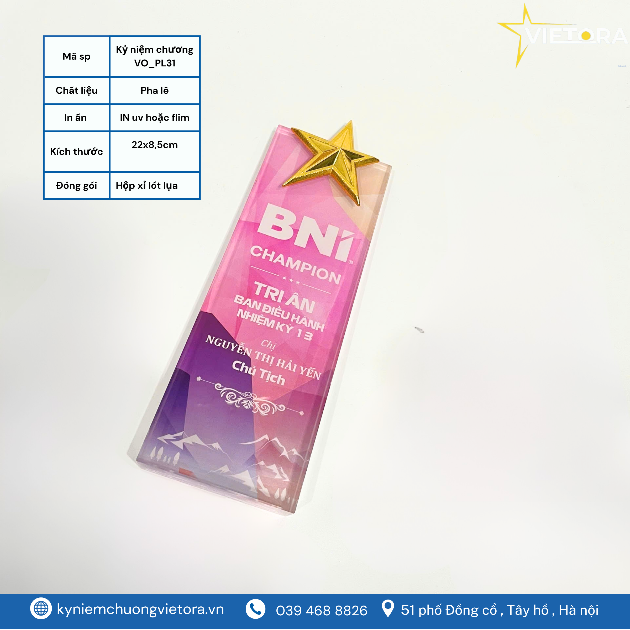 Chất liệu pha lê quang học trong suốt mang lại độ sáng vượt trội, khi đặt dưới ánh sáng tạo hiệu ứng phản chiếu lấp lánh – khiến logo, dòng chữ “BNI CHAMPION – TRI ÂN” trở nên nổi bật và trang trọng hơn bao giờ hết.