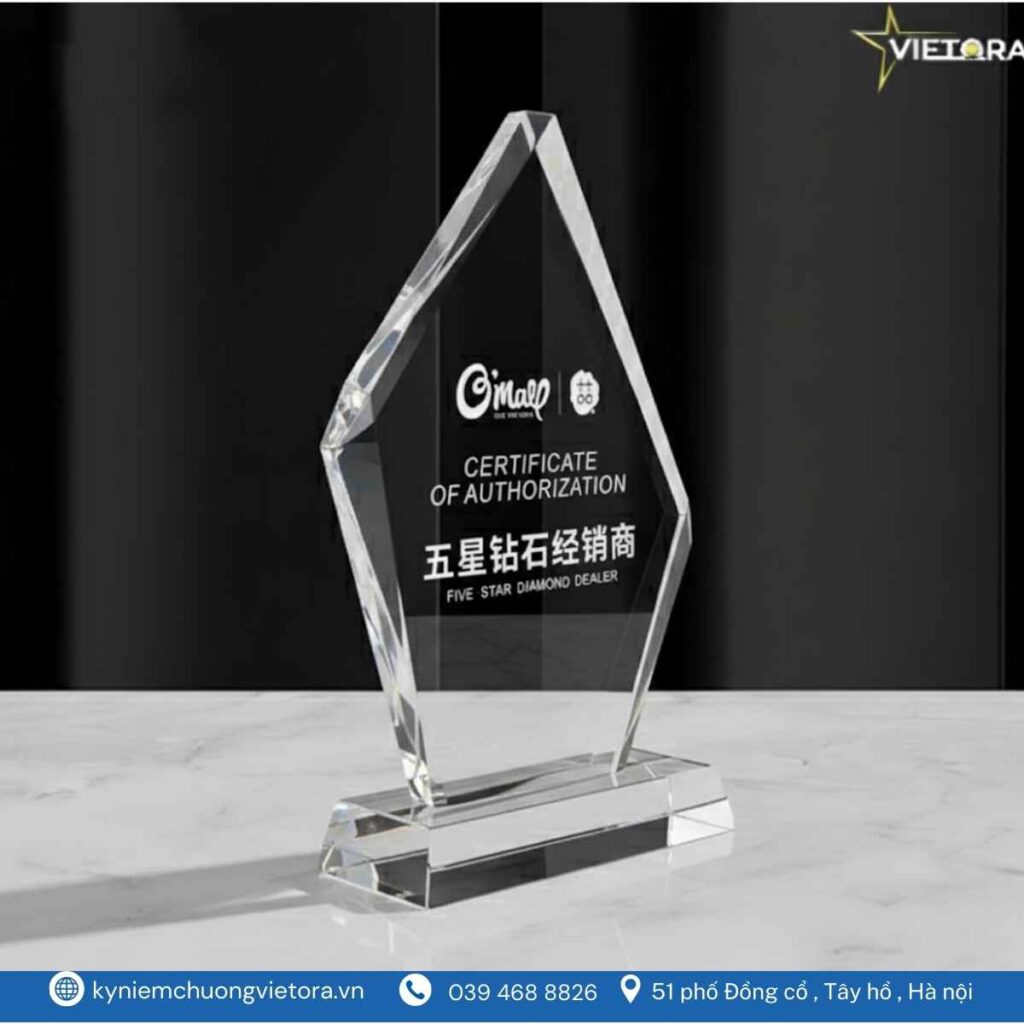 Vietora chuyên thiết kế và sản xuất kỷ niệm chương pha lê theo yêu cầu với số lượng linh hoạt, thời gian nhanh chóng và chất lượng đảm bảo. Khách hàng có thể tùy chỉnh nội dung, logo, kích thước và kiểu dáng để phù hợp với từng sự kiện cụ thể.